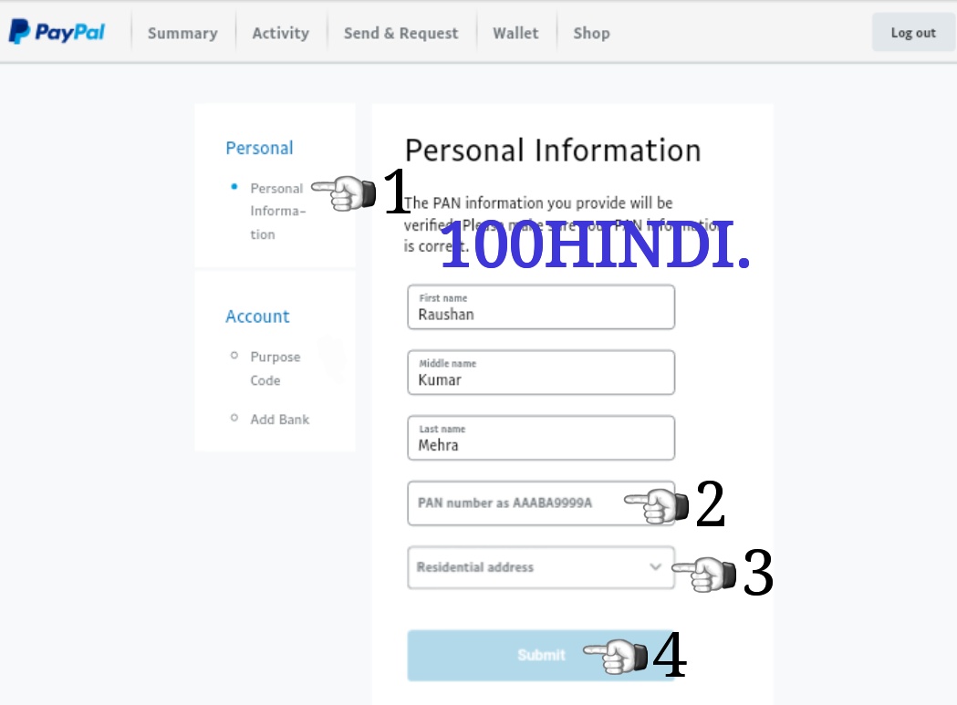 Isme aapko "(1) personal" per click karna hai ! "(2) apna pen card ka no. Dale "! "(3) apna address select kare" !(4) submit par click kar de ! Ab aapka PayPal account Puri Tarah verify ho chuka hai, ab aap isme apna payment except aur transfer kar sakte hain, aapka PayPal account ka number hoga aapka email ID Jo Apne PayPal account Banane Samay use kiya tha Usi ke jariye aap apna payment except or transfer Karenge ! yadi Koi Aur Bhi problem ho PayPal Account Banane mein Tu Hume comment Karke pooch sakte hain! yeah Hamare social site se Jod kar ke sawal kar sakte hain namaste aapka apna website